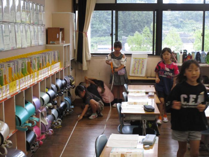 まきじゃくを使って教室のたてやよこ、ろうかの長さをみんなで協力して測っていました。実際に…