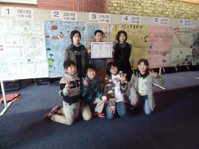 食農活動と壁新聞コンクール   2月22日(土)JA主催のコンクールに5年生が参加しました。この1年間、三農会の皆さんのバックアップとJAの皆さんの指導で学習してきた成果を…