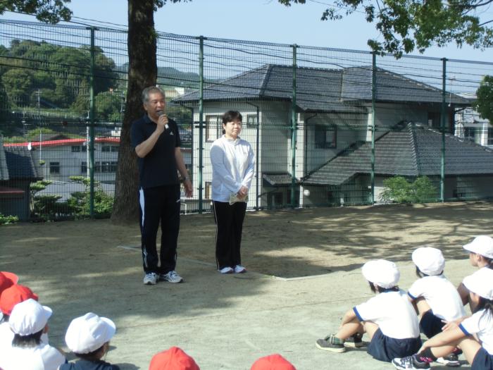 着任式 1年1組の新しい担任が着任しました。運動会の練習の前に、子どもたちに紹介がありました。