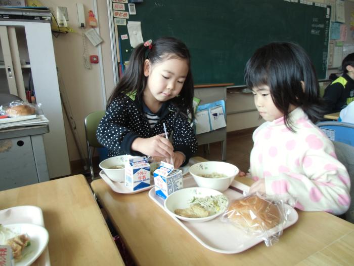 保育園との交流給食(3年生)   今回はひとみ保育園のお友達13人が来てくれました。学校探検の後、3年生の教室で一緒に給食を食べました。今日の給食は「きつねうどん」と「もやし…