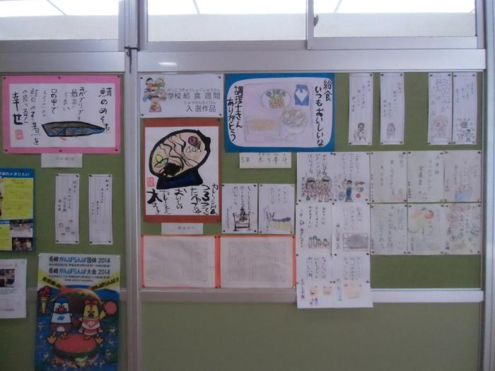 給食週間入選作品   給食週間に取り組んだ子どもたちの作品の中でよかったものを表彰します。入選した作品は現在職員室前の掲示板に展示されています。子どもたちの素直な…