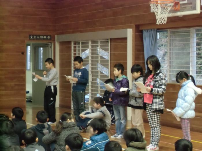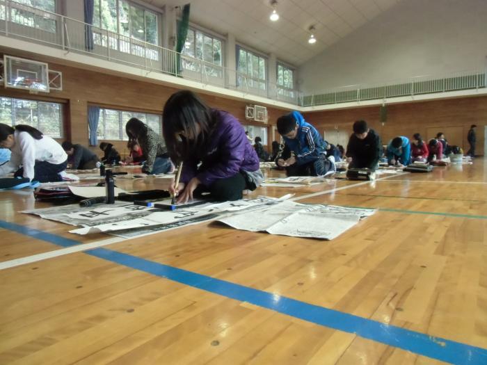 書き初め(4〜6年) 2,3校時目に体育館で「合同書き初め」を行いました。集中して筆を走らせる姿は大変引き締まっており、新年にふさわしい行事となりました。4年生は…