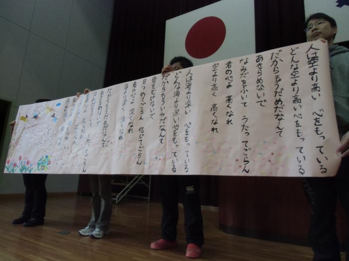 音楽朝会 今回の歌は「空より高く」です。曲の一部に「蛍の光」の一節が使われている、とても珍しい歌です。互いを認め合い,励まし合う歌詞が心を打ちます。体…