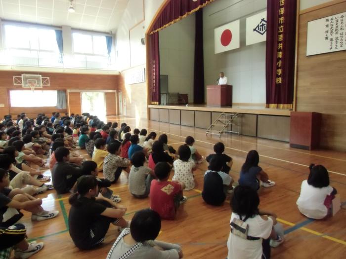 前期終業式 今日で前期が終わりました。校長先生からは次のようは話がありました。「通知表にはがんばったことがたくさん書いてありました。特に、『進んで』や『…