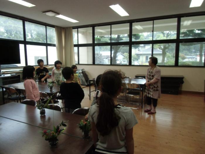 お花教室(2年生) 毎月一回行われる「お花教室」です。今回は2年生10名がお世話になりました。さざんかなどの秋の花を中心に、先生の自宅の庭にある花などをアレンジ…