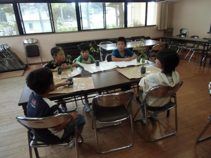 いけばな教室 月に1回、児童10名ずつを対象に「いけばな教室」を行っています。講師は地域のボランティアの方にお願いしています。今回は講師の先生のご自宅の庭…