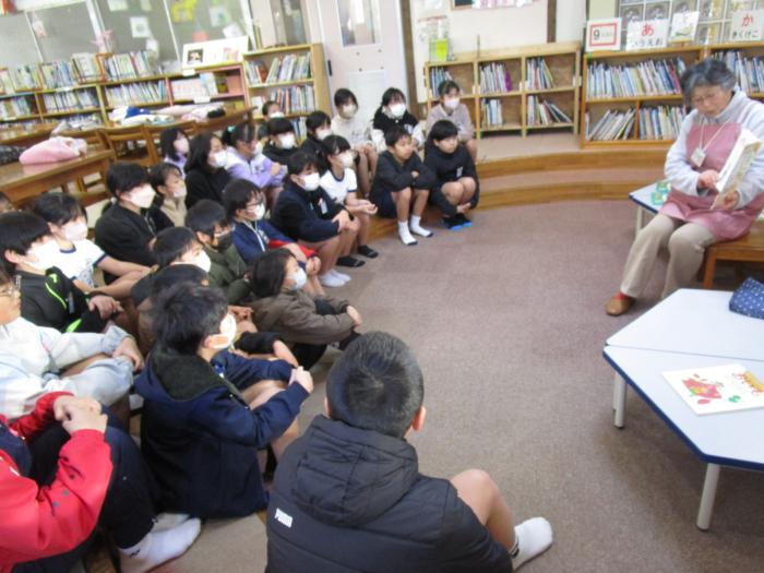 読み語り   今朝は図書ボランティア「ゆめのか」の皆様にご来校いただき、読み聞かせをしていただきました。