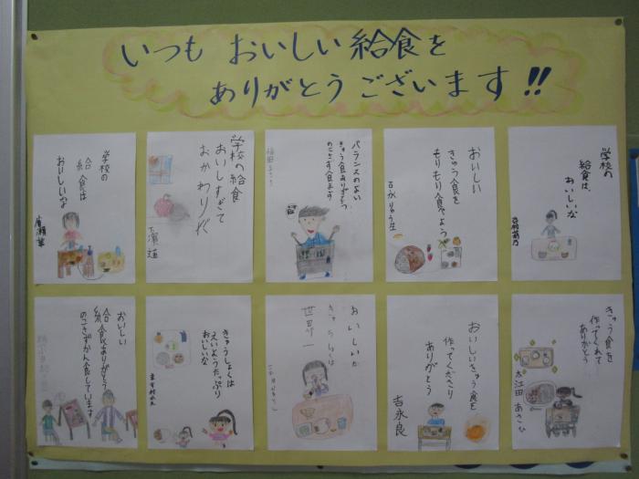 給食ありがとうございます!   3年生が給食週間中に書いた感謝の気持ちが掲示してあります。