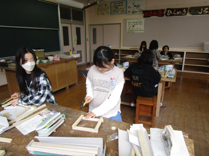 図工室に入ってみると4年生が木材にクギを打っている姿が見えました。