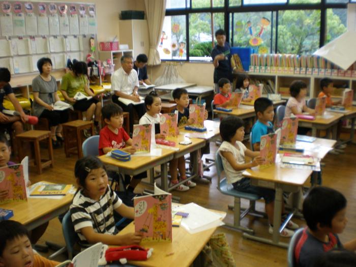 1年生、暑い中、がんばって国語のお勉強を見せ…