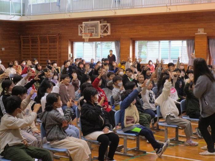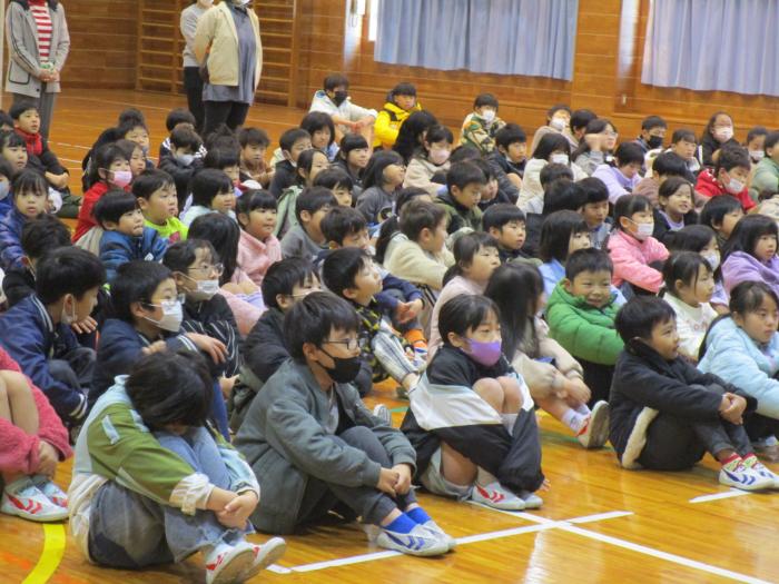 かがやき集会   今日の朝の活動は全校児童が体育館に集まり「かがやき集会(人権集会)」を行いました。