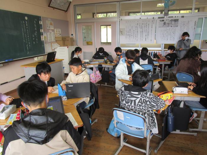 国語科の教材「鳥獣戯画を読む」の表現の工夫を見つける学習でした。互いの意見を聞き合い、考えを深め…
