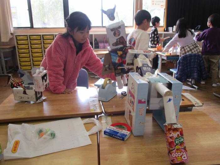家庭から持ってきた空き箱を使って、思い思いの動物を作っていました。じつにのびのびと作品を…