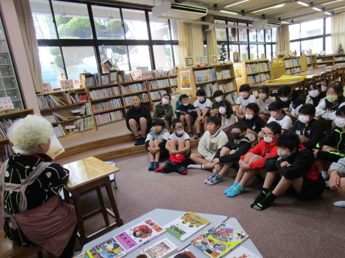 読み語り   今日は朝から読み語りでした。図書ボランティア「ゆめのか」の皆様にじっくり本を読んでいただきました。