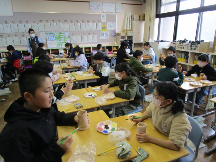5年生陶芸教室絵付け体験   今日の3〜4校時は5年生が陶芸教室の絵付け体験に挑戦しました。