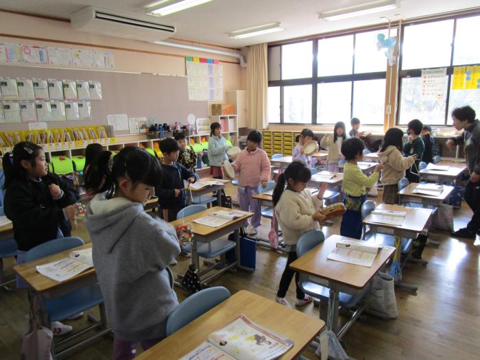いろんな楽器   校舎のどこからかにぎやかな音が聴こえてきたので、その音を頼りに行ってみると、音の出どころは1年生の教室でした。