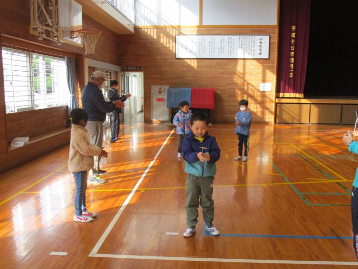 1年生むかしあそび   今日は1年生が「むかしあそび」に挑戦しました。たけとんぼ、けん玉、お手玉、竹馬、こま回し… 地域の皆様にやさしく教えていただきながらむかしあ…