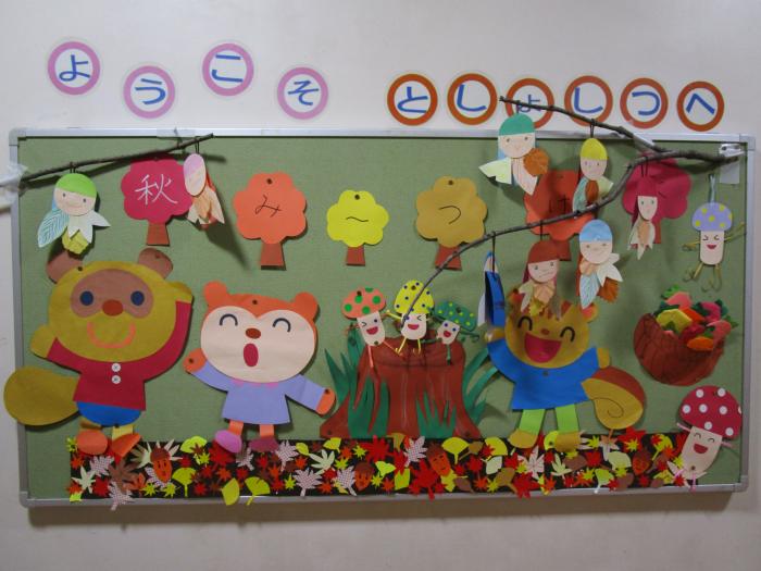 秋みーつけた 図書ボランティア「ゆめのか」の皆様がつくってくださった壁飾りが図書室前の掲示板に飾ってあります。