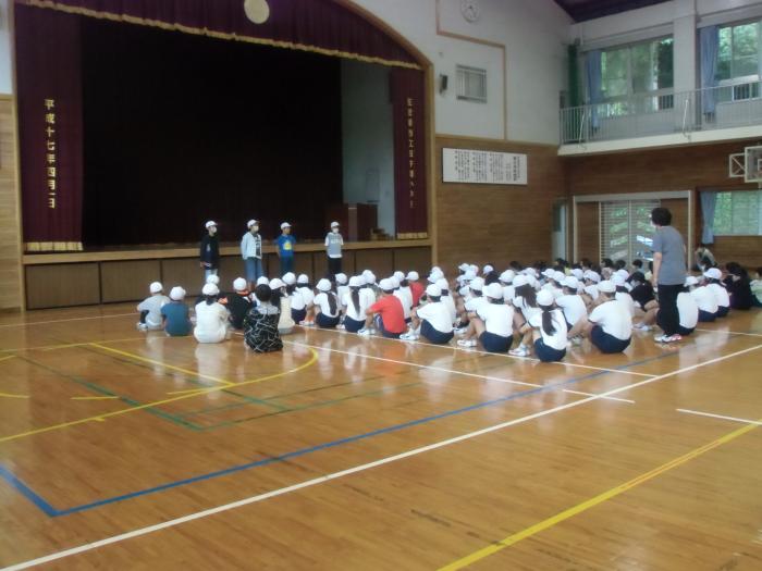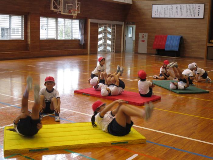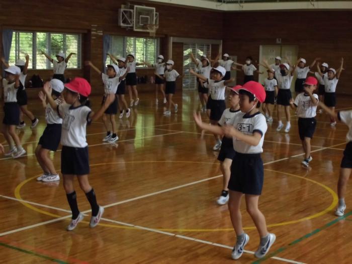 やってみよう! 体育館をのぞいてみると、3年生、4年生が運動会のダンスの練習をしていました。「やってみよう!」の曲に合わせておどりを覚える真っ最中でした。運…