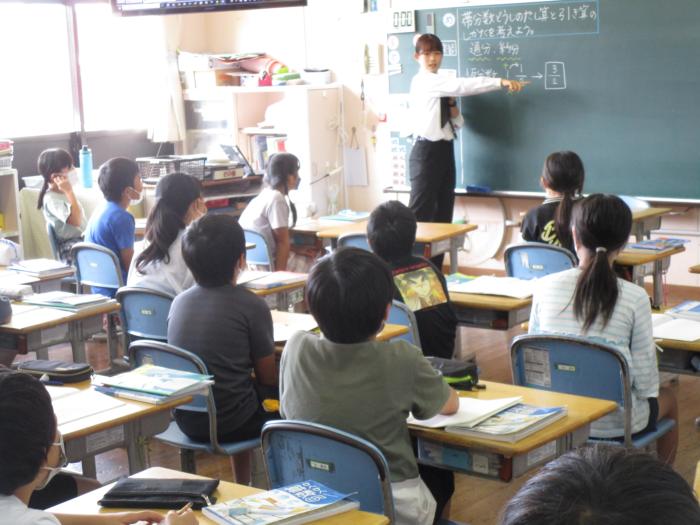 算数科における分数の学習を指導する実習生。その熱意にこたえようとする5…