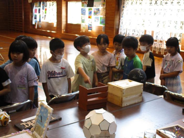 2年生校内夏休み作品展の鑑賞 体育館をのぞいてみると2年生が校内夏休み作品展を鑑賞していました。「うわぁ!これ上手!」「これどがんしてつくったとやろ?」などなど… いろん…