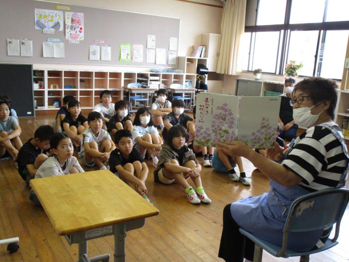 図書ボランティア「ゆめのか」の皆様に本を読んでもらいました。1学期最後の「読み語り」です。みんな真剣な…