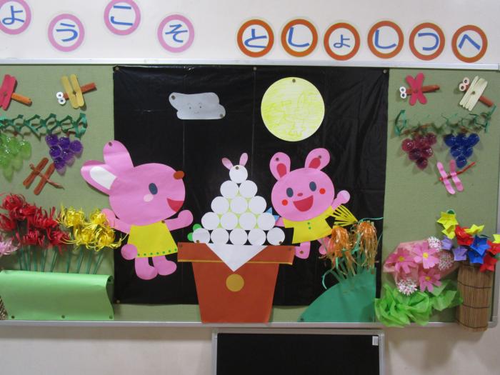 お月見の飾りです 図書ボランティア「ゆめのか」の皆様がつくってくださった「お月見」の飾りです。図書室前の掲示板に飾ってあります。「うさぎ」「おだんご」「お月様…