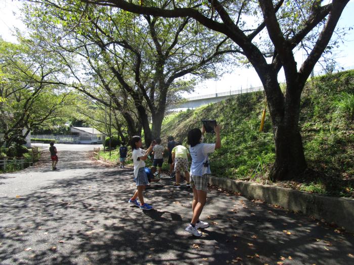 4年生理科の時間 4年生が理科の学習で武道館前の桜の木の観察をしていました。