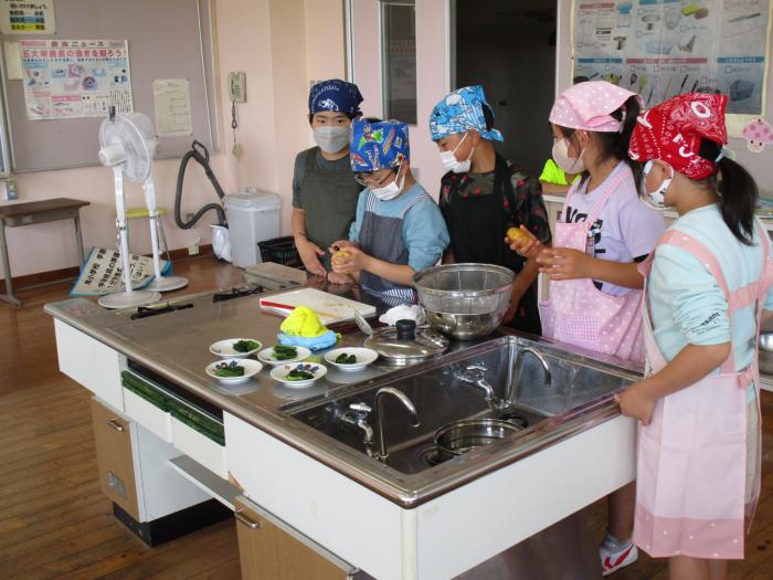 5年生 家庭科の調理実習 午後の家庭科室では5年生が家庭科の時間に調理実習にチャレンジしていました。ホウレン草やじゃがいもを包丁で切ったりゆでたりする作業を、グループ…