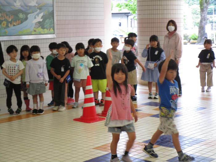 1年生 交通安全教室 今日は江迎警察署のおまわりさん、波多さんをお迎えして1年生を対象に「交通安全教室」を実施しました。本物のおまわりさんを前にして、少し緊張気味…