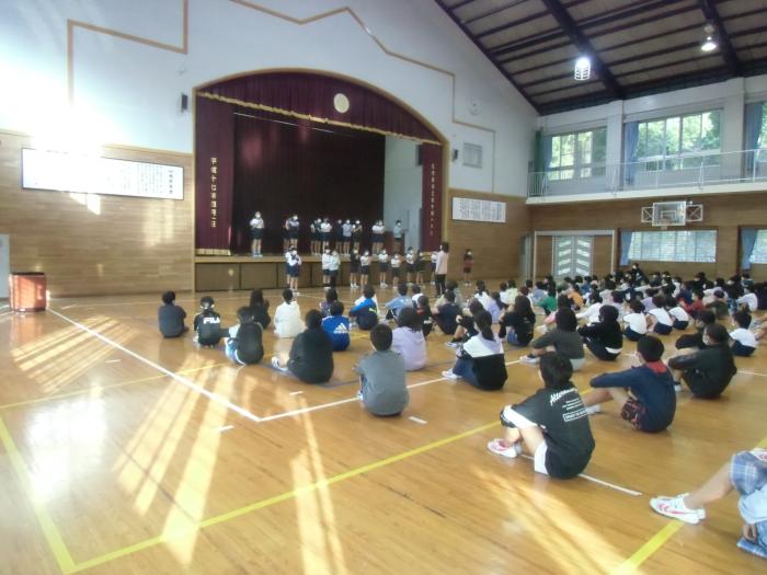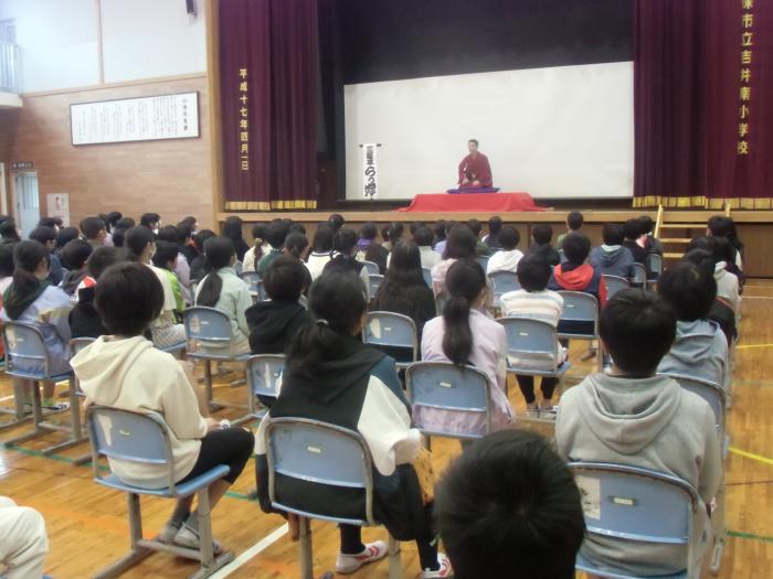 落語会 午前中に4〜6年生を対象に体育館で落語会がありました。佐世保市出身の落語家三遊亭らっ好さんに来校していただき、落語の披露していただきました。…