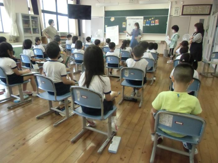 外国語活動 今日は、ゲストティーチャーを招いて外国語活動を行いました。2校時と3校時に楽しく外国語を学びました。3校時は2年生で、英語でのあいさつを行い…
