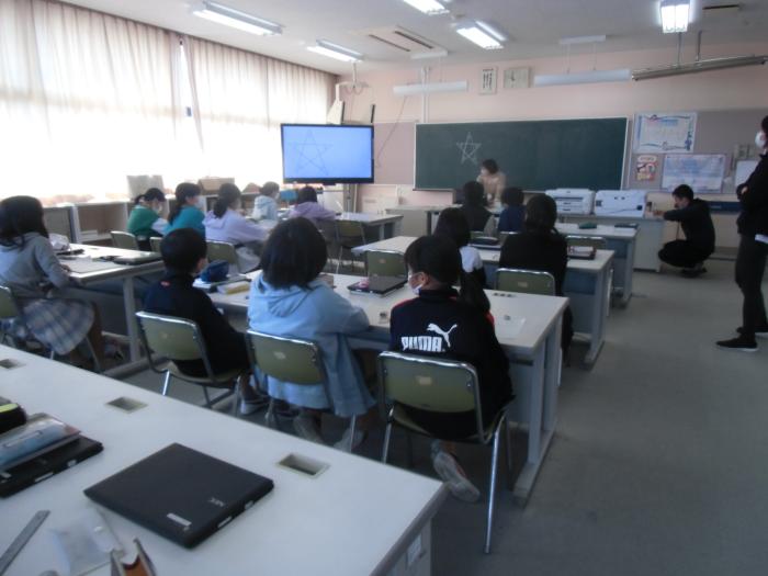 乗り入れ授業 6年生が4校時に、吉井中学校から数学の先生から授業をしていたさきました。図形の角度の問題で、図形の見方、同じ角度を探す力、証明の元になる考え…