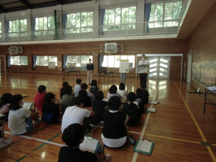 長崎歴史文化博物館による移動博物館 今日は、長崎歴史文化博物館より3名の方に来ていただき、体育館で移動博物館を行いました。6年生は3〜4時間目に学習して、昼休みには、他の学年の…