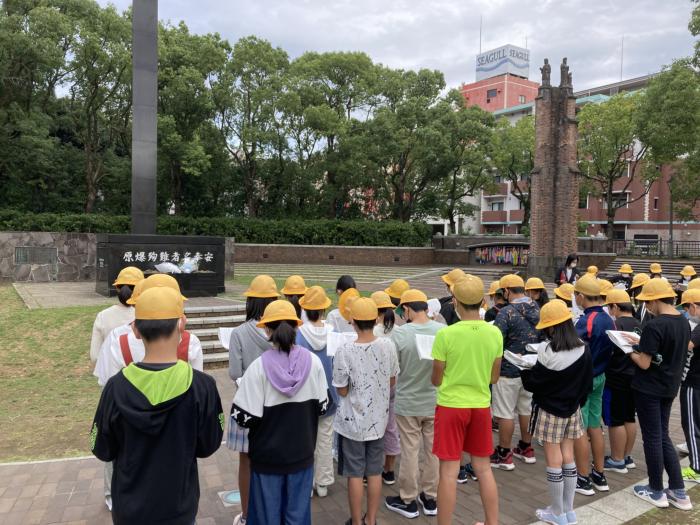 修学く旅行A 6年生の修学旅行は、爆心地公園に到着しました。本日の前半は、原爆資料館や平和公園、山王神社などを巡り平和学習をします。