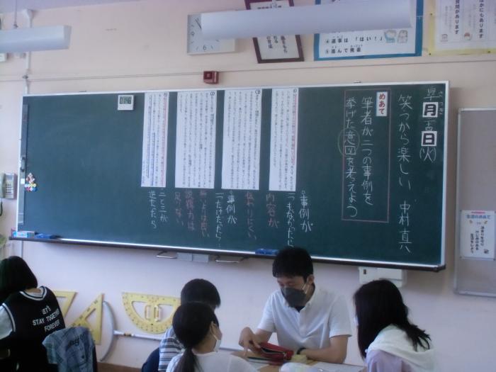 授業風景 6年1組で国語の授業を行いました。本校の校内研究の提案授業でした。「笑うから楽しい」という説明文を子どもたちが読み、事例の効果を考える授業で…