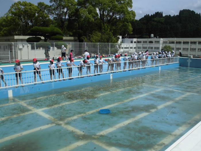 プール掃除T 5〜6校時に5・6年生がプール掃除を行いました。6年生が低学年用プールを中心に5年生がプール回りを中心に行いました。高学年として、汚れた所を…