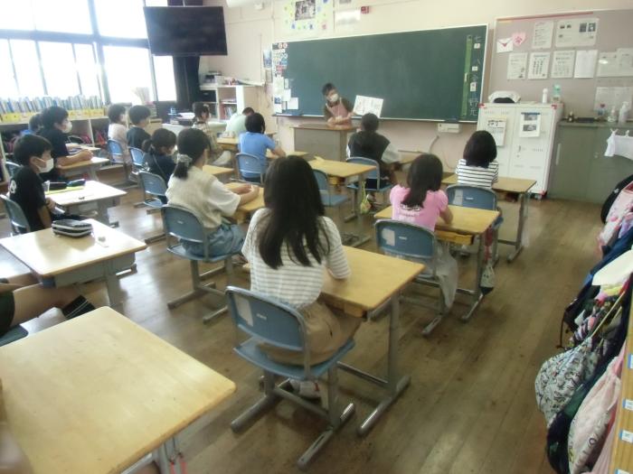 読み語り 毎週、金曜日は読み語りの方が来てくださっています。今回は4・5・6年生の高学年への読み語りで、この教室では手話を取り入れた本を読んでください…