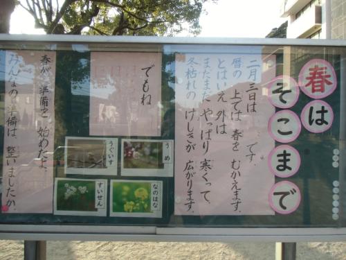 春はそこまで(校門掲示板) 昨日、今日と、午後からとても暖かくなりました。教室内も暖房がいらないほどで、確実に春が近付いていることを感じます。日もずいぶん長くなりました…