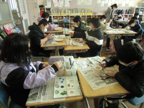 焼物絵付け体験(5年生) 5年生の子どもたちが、佐々町皿山窯の新井先生のご指導のもと、12月に成形した焼物に絵付けを行いました。使用する色は6色。子どもたちはマイ・カ…