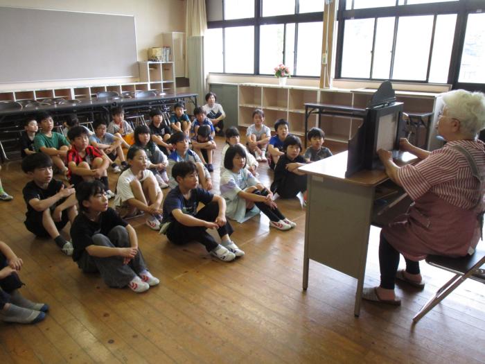 4年生 読み聞かせの時間です 今日は朝から図書ボランティア「ゆめのか」の皆様による読み聞かせを行いました。4年生は「ふしぎなしゃもじ」という、昔話の紙芝居を読んでいただき…