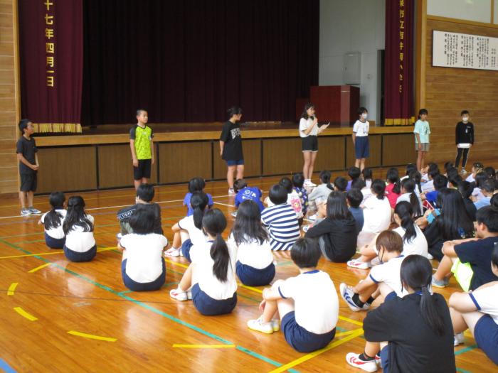 全校集会 今日は昼の時間を使って全校集会を行いました。南小の7つの委員会の委員長が自分たちの活動の内容やお知らせを発表しました。「みんなのために」委員…