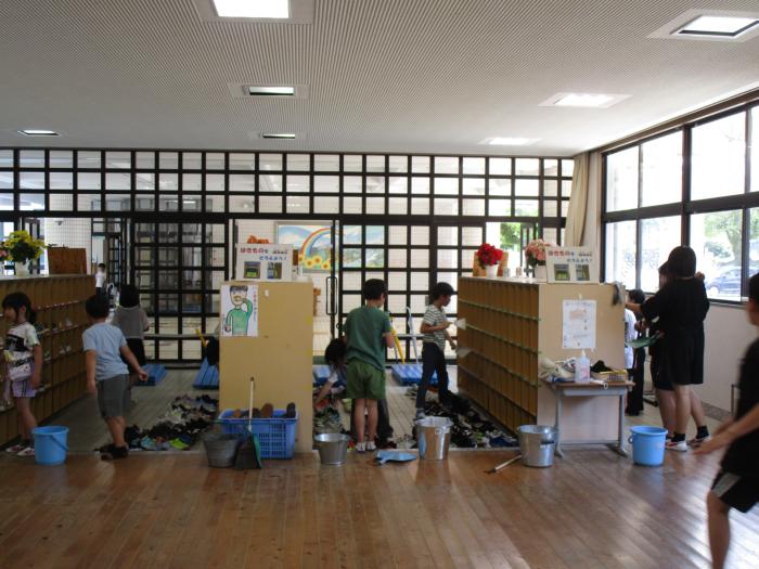 みんなで使うくつ箱をみんなできれいにそうじしています。