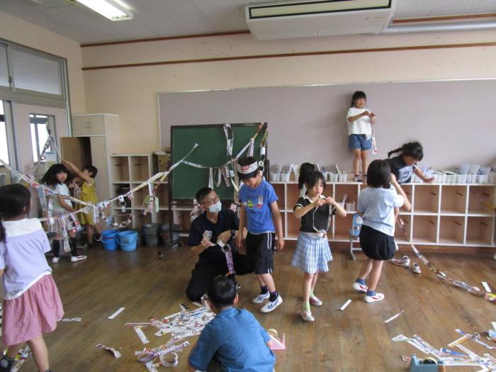 教室を切ったり貼ったりした紙で飾っていました。みんなで協力して、とても賑やかな飾りをつくっていまし…