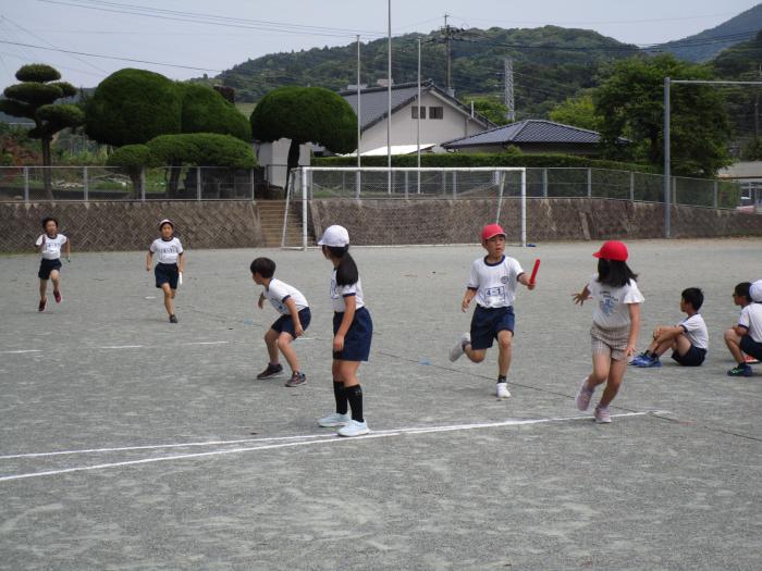 4年生 体育の時間です 運動場から元気な声が聞こえてきました。足を運んでみると4年生が体育でリレーの練習をしていました。走る順番を決めたり、バトンパスの練習をしたり…