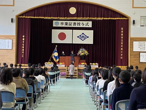卒業式の準備 明日の卒業式に備えて、今日は全校で準備に取り組みました。4校時は全校で大掃除をして、5校時は4・5年生が残って、会場設営の仕上げを行いました…