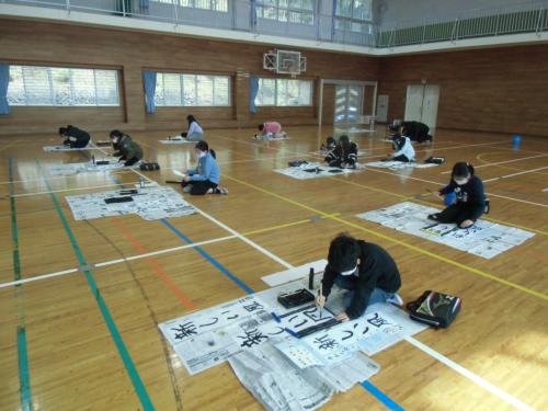 書き初め 3連休の前日、初日と雪が続きましたが、皆様いかがお過ごしでしたでしょうか。さて、今週は書き初め週間です。今日は、5年生と6年生が書き初め(5…