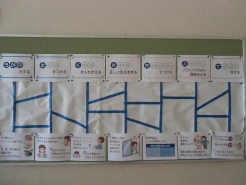 保健室掲示 養護教諭の山口先生が作成した、保健室の入口の掲示物です。〇の中に文字を入れて言葉を完成させます。あみだくじになっていて、それをたどっていくと…
