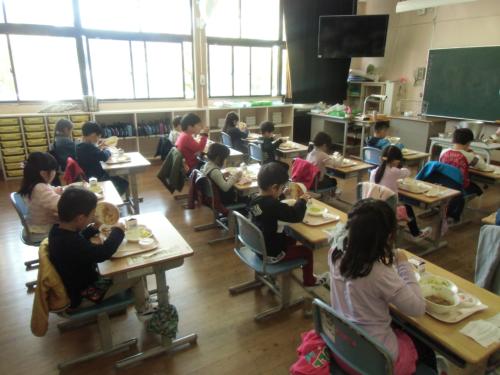 初めての給食! 今日から1年生の給食が始まりました。今日のメニューは、ポークカレー、コールスローサラダ、ももゼリー、牛乳でした。6年生に手伝ってもらいながら…