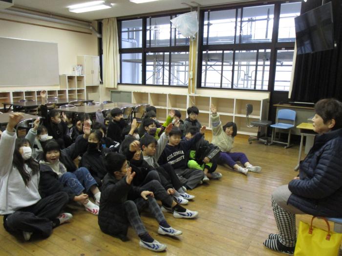 読み語り 今朝は図書ボランティア「ゆめのか」の皆様による読み語りの時間でした。